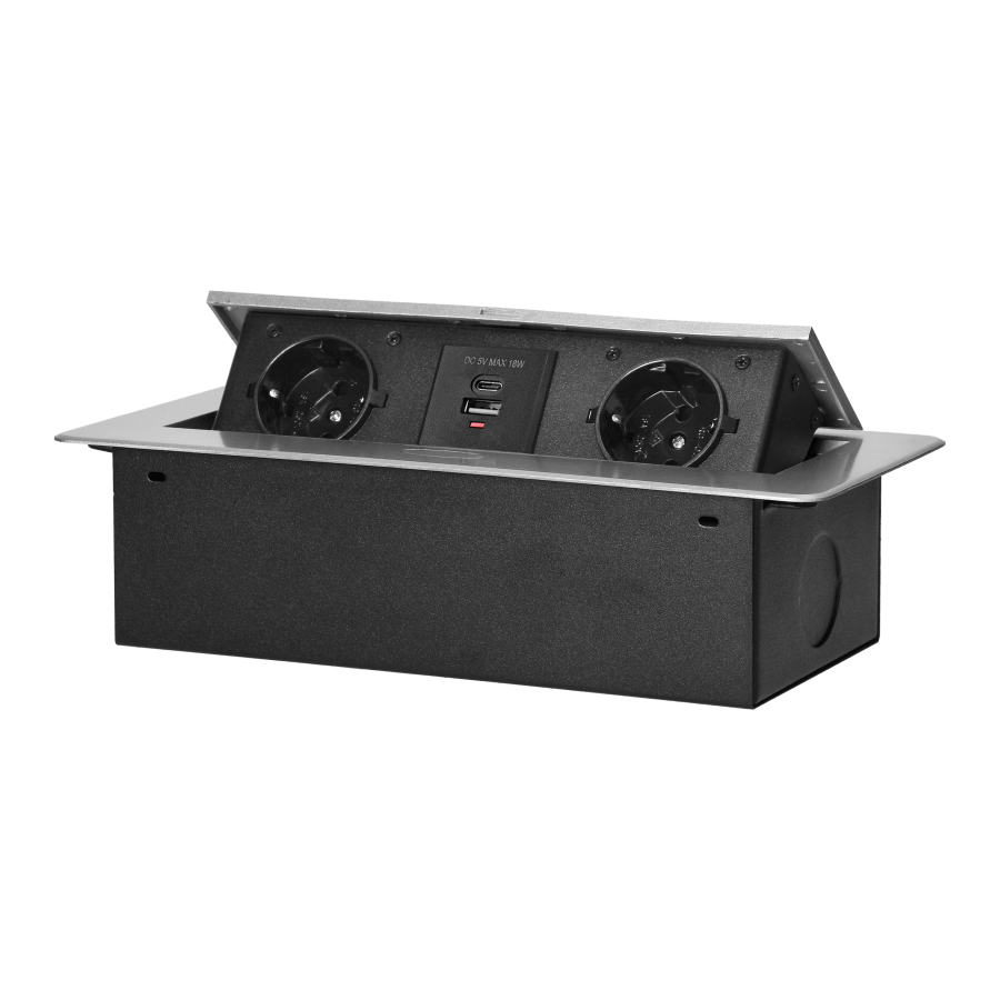 Elegantno i funkcionalno rješenje za modernu radnu površinu, kuhinju ili ured. Ova ugradbena utičnica za namještaj omogućava uredno napajanje električnih uređaja i praktično punjenje mobilnih uređaja direktno iz površine stola ili pulta.